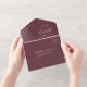 The left-hand edge of this elegant modern all-in-one wedding invitation and RSVP features a silver faux glitter border. The customizable text combines silver gray whimsical handwriting, copperplate and italic fonts on a burgundy background. The return address appears on the outside flap and the reverse side of the detachable RSVP card in silver gray text on solid burgundy.