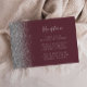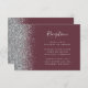 The left-hand edge of this elegant modern wedding reception enclosure card features a silver faux glitter design. The customizable text combines silver gray handwriting, copperplate and italic fonts on a burgundy background. The reverse side features a matching burgundy and silver glitter design.