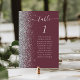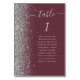 The left-hand edge of this elegant modern wedding table number card features a silver faux glitter border. The word "table" appears in silver gray whimsical handwriting script on a dark burgundy background. Add the names of your guests who are assigned to each table.