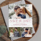 Announce your wedding date in style with our modern photo save the date cards. The front of the design features three of your engagement photos with "Save the Date" displayed in burgundy modern serif and script fonts. Personalize the front of the multi-photo save the date card by adding your names, wedding date, and wedding location. The elegant save the date card reverses to display a burgundy and white trellis pattern.