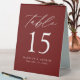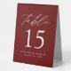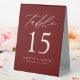 Trendy, minimalist wedding table number tent signs featuring white modern lettering with "Table" in modern calligraphy script. The design features a burgundy background or a color of your choice. The design repeats on the back. To order the table number tent signs: personalize with your names, wedding date, and table number. Add each number to your cart individually and check out when you're finished.