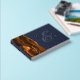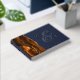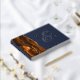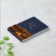 This elegant wedding guest book features a burnt orange watercolor agate design trimmed with faux gold glitter. Easily customize the real gold foil text on a navy blue background, with the names of the couple in whimsical handwriting calligraphy over a large ampersand. Add additional text of your choice to the front and spine.