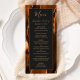 This elegant, modern wedding menu features a watercolor burnt orange agate background trimmed with gold faux glitter. The text appears in elegant gold colored handwriting and copperplate fonts on a dark off-black rectangle. The agate design is repeated on the reverse.
