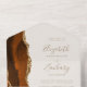 The left-hand edge of this elegant modern all-in-one wedding invitation and RSVP features a burnt orange watercolor agate border trimmed with faux gold glitter. The customizable text combines gold-colored handwriting, copperplate and italic fonts on an ivory background. The return address appears on the outside flap and the reverse side of the detachable RSVP card.