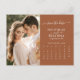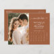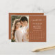 Modern Burnt Orange Save the Date Photo Calendar Postcard. Easily personalize by replacing each info. Please upload a portrait/vertical photo. Move the circle by clicking the link Customize further. Make sure to check the preview before adding to cart. (Photo by Jonathan Borba from Pexels)