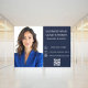 Modern business window cling with photo, contact info, and QR code. Perfect for real estate agents, salons, boutiques, and offices. Easy to customize with your own branding to create a professional and welcoming storefront display. Navy blue background, white text.