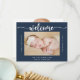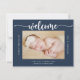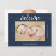 This modern calligraphy blue birth announcement card is perfect for a simple baby welcome celebration. The design features a beautiful font in a navy background to compliment your event.