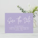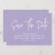 Modern calligraphy save the date with a digital lavender background and a scannable QR code for a website or contact information on the back.