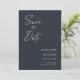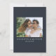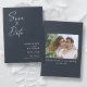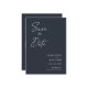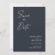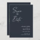 Modern, minimalist and elegant "Save The Date" wedding engagement photo cards. This custom design featuring elements of modern text with a unique calligraphy ink script. The couples photo highlights the back of the card. Colors are white writing on slate blue or easily customize the base color as needed.