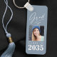 A trendy, modern two sided, sturdy aluminum, Graduate keychain - keyring with your photo on the front. All Personalized, featuring "Grad" in elegant calligraphy ink script with "Class of, The Year, School Name & Your Name" in modern typography. The graduate's photo is artfully accented with a delicate gradient boarder. The text and trim are white with the background in a chic dusty blue color. If you wish, easily edit the background color to your school's primary color. The perfect Graduation gift idea for high school, college and university students.