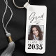 A trendy, new two sided, sturdy aluminum, Graduate keychain - keyring with your photo on the front. All Personalized, featuring "Grad" in elegant calligraphy ink script with "Class of, The Year, School Name & Your Name" in modern typography. The graduate's photo is artfully accented with a delicate gradient boarder. The text and trim are regal black with the background in white. If you wish, easily edit the background color to your school's primary color. The perfect Graduation gift idea for high school, college and university students.