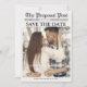 Minimalist calligraphy newspaper wedding save the date with two photos, .Immerse your guests in the enchanting narrative of your love story with headlines that celebrate your journey together. From the engagement announcement to the forthcoming wedding date, every detail is tastefully showcased in classic newspaper format, complete with captivating imagery and personalized messages.