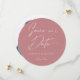 Modern classy calligraphy circle save the date card with minimal text on the front on a soft dusty rose blush pink background and your image of choice on the back. Customize this round save the date card it with your own photo, names, wedding date and location and make it uniquely your own. All colors (text and background) are customizeable too.