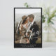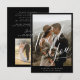 Elegant, romantic, trendy chic, hand-lettered white script wedding black thank you card template with two photos, your custom text, and signature.