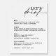 This beautifully designed sign features elegant calligraphy that complements any modern wedding theme. Made from high-quality materials, it’s durable and perfect for showcasing your drink offerings in style. Whether displayed at the bar or reception, this sign not only guides your guests but also enhances your decor with its chic aesthetic. Personalize it to reflect your unique style and create an inviting atmosphere for your special day. Make a lasting impression with this stunning bar menu sign!