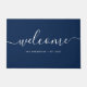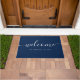 Doormat featuring the word "Welcome" in modern calligraphy script and that you can personalize with your family name all against an editable background color (click customize to change).