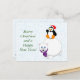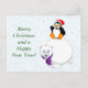 Modern cartoon of a penguin riding a polar bear, holiday postcard