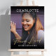 Elegant celebration of life funeral foam board featuring a photo of the person who is being remembered, a black overlay, the sympathy saying "forever loved, never forgotten", their name, and birth/death dates.