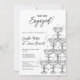 Celebrate your love story with this chic and minimal champagne tower engagement invitation. The front features a hand-drawn stack of bubbly coupe glasses in black linework, paired with stylish calligraphy and serif fonts. The back showcases three photo slots to add your favorite engagement memories, creating a personal, elegant touch. Ideal for modern couples planning a cocktail soirée, rooftop celebration, or classy dinner party.