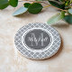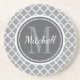 A modern sandstone coaster featuring a classic quatrefoil pattern in charcoal gray and white with a bold circular monogram frame displaying a custom initial and family name in elegant script. The timeless geometric pattern paired with the personalized center creates a sophisticated accent for any home. A great gift for housewarmings, weddings, or anyone who appreciates classic pattern design. All text is fully customizable.