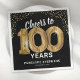 Elegant 100th birthday party napkins featuring a stylish black background that can be changed to any color, gold sparkly glitter, the saying "cheers to 100 years" using one hundered gold hellium balloons, their name, and the date of the celebration.