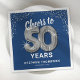 Elegant fiftieth birthday party napkins featuring a stylish navy blue background that can be changed to any color, silver sparkly glitter, the saying "cheers to 50 years" using silver gold hellium balloons, their name, and the date of the celebration.