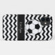 Modern and trendy chevron stripes iPhone case features black and white chevron stripes, a soccer ball and a black accent border frame for your name, initial or other text. Show your personality with this fun and trendy iPhone case. Makes a great gift for all occasions. Click the "Customize it!" button to change the text size, text color, font style and more!