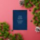 Featuring a modern design with tropical real gold foil palm leaves frame over a navy blue background combined with an elegant calligraphy typography, for a chic look.