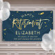 Modern Happy Retirement Custom Name Banner with festive printed gold confetti Illustrations on dark teal blue. Personalize with your name and another 1 or 2 lines of custom text as well as the option to change the background to another color in the design tool under "customize further".