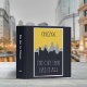 Modern Chicago, Illinois travel poster on front of this travel scrapbook and/or photo album. The image is a simple, modern style with a double silhouette skyline of black and gray buildings in foreground with golden background and white thin border. Binder has a black background. Templates provided on spine. Perfect for your vacation scrapbook memories and/or photos from a trip to Chicago, Illinois.