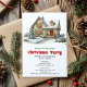 Invite your loved ones to a warm and joyful celebration with this watercolor Christmas invitation featuring a cozy Christmas house and festive winter scene. Designed in a classic red and green color palette, this card captures the timeless beauty of the season with its hand-drawn details and playful lettering.