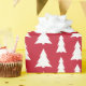 Modern Christmas pattern features white geometric trees in varying sizes on a red background. Perfect for holiday wrapping.