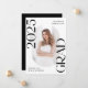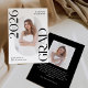 Announce the graduate's big achievement in style with this modern photo graduation announcement. The trendy design features "Class of 2026 Grad" in bold black lettering with subtle script accents with a solid white background. The graduate's vertical photo is displayed inside an oblong frame at the center of the announcement. Personalize the front of the black and white graduation announcement with the graduate's name and school. The announcement reverses to display an additional photo displayed inside of a white square frame with your custom text shown below. The stylish graduation announcement is perfect for high school and college graduates.