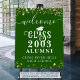 Welcome alumni to their high school or college class reunion (editable for any year reunion) with this custom color (shown in green, gold and white) foam board sign featuring gold stars, string lights, handwritten script and decorative typography and personalized with your school name and graduating class year. The colors can be changed to your school colors or coordinating party theme colors. FOAM BOARD OPTIONS: The sample is shown on a 22x28" foam board--other sizes are available or the design can be transferred to a poster, banner, tapestry backdrop or other product on the ordering page or converted by the designer as an instant digital download file for local printing. ASSISTANCE: For help with design modification or personalization, color change, resizing, transferring the design to another product or converting to a Download file, contact the designer BEFORE ORDERING via the Zazzle Chat MESSAGE tab below or email makeitaboutyoustore@gmail.com.