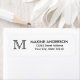 The design features a personalized monogram initial, name and address details in a simple and modern typographic font.