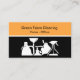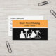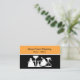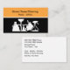 Cleaning service unique business cards with simple yet powerful graphic design including black, orange and white colors, image of cleaning supplies symbol, and eye catching graphic design that stands out and makes a strong first impression. Designed as a business card template for a home or office cleaning service, housekeeper, or professional cleaning business.