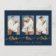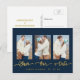 Gold Curved Hand Lettered Save Our Date Design - Navy Blue Modern 3 Photo Save the Date Postcard . Elke Clarke © Other styles and colors available in our shop at www.zazzle.com/monogramgallery