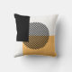 This trendy modern geometric pillow features large rectangular color blocks in mango, black and white, complemented by a black striped circle.