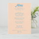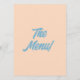 A colorful retro funky modern peach yellow wedding dinner menu. Which features chic template design of boho vintage peach background and blue bold typography. Perfect and matching with the whole suite.