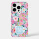 Customize this gorgeous modern colorful flower garden of flowers in pink, blue, purple and yellow iPhone 16 pro case with your your initials in a modern CAP font in white on blue. It's so vibrant and happy!