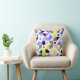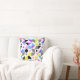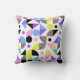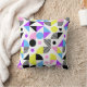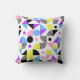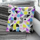 This modern pillow features colorful seamless geometric pattern with lines and shapes in yellow, blue, pink, purple, and black on white background.