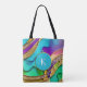 This all over pattern tote bag design features a beautiful, colorful design with turquoise, purple, blue, and green swirled with faux metallic gold. The center holds a monogram initial. The design appears three dimensional. Super unique and fun, it is definitely one of a kind! Created by Simply Farmhouse Press.