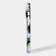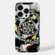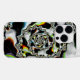 This iPhone case features an abstract, psychedelic spiral fractal art in black and white with yellow, orange, blue, and green accents.