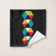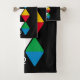 Add some bold, vibrant style to your bathroom or washroom decor with this modern, colorful monogram bath towel set. The design shows a series of geometric triangles in a famous color theme of blue, yellow, black, green, red plus white, against a rich black background. At both ends, there is a CUSTOMIZABLE MONOGRAM, which you can personalize with your own initial. Choose from a wide selection of matching gifts designed by Berean Designs.