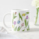 The product design features a pattern of colorful tulip flowers in purple, red, pink, blue, and yellow. This botanical illustration makes a modern and unique large coffee mug - Gift idea for birthday, Easter, Mother’s Day, wedding, and more!