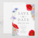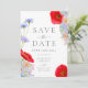 Beautiful elegant watercolor colorful summer wildflower florals wedding save the date invitation. Meadow flowers include cosmos, cornflowers, poppies and forget me nots with foliage in blush blue, dusty blue, navy blue, cornflower blue, red and pastel colors with blue, pink, orange, purple, green and yellow hues. Easy to use template with modern romantic typography script with bride and grooms monogram initials. Perfect for a unique floral botanical theme summer or spring wedding with slate gray typography script. Unique original artwork by artist Catherine Sweetman
