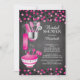 Modern stock the kitchen bridal shower invitation featuring a rolling pin, mixing bowl, spatula, pizza cutter, whisk, vegetable peeler and measuring spoons set on a contemporary chalkboard background with hot pink & black polka dot confetti. Visit our shop to view this invitation in a variety of popular wedding shower invitations.