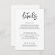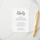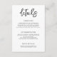This contemporary wedding details card features a minimalist black and white design with a decorative font. The information is clearly displayed in sections for transportation and accommodation. A website address is also included at the bottom for any additional details.