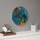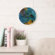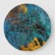 A gorgeous, trendy wall clock which has a background effect of a blue green copper metal with gold overlay. A unique and elegant addition to any home.