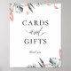 Modern tropical foliage in trendy silver sage green and coral pink, personalized wedding "cards and gifts" sign poster. Modern typography design style mixes script with bold type.